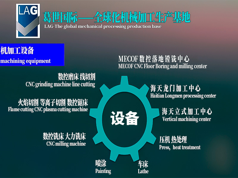 山東嘉意機械有限公司配置有國內外前列的機械加工母機,其中意大利MECOF 360° 旋轉頭、5軸聯動落地鏜銑加工中 心3臺;配置360°側銑頭5軸龍門加工中 心6臺;立式加工中 心10余臺;配套的數控車床、銑床、磨床、線切割、大力銑床、火焰切割、等離子切割機、大型壓力機、正火爐等國際前列加工母機70余臺套。生產國際前列水準的數控折彎機、剪板機、數控沖床等鈑金加工設備,打造葛世國際技術品牌。